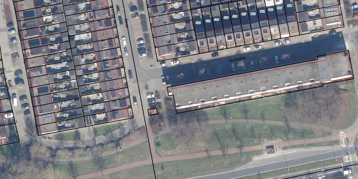 Het perceel waarop Sumatra 151 staat heeft een oppervlakte van 1565 m². Dit is een zeer groot perceel. De perceeloppervlakte wordt geregistreerd door het Kadaster. Gedetailleerde informatie over de maten van dit perceel kunt u vinden in het rapport Kadastrale kaart met maatvoering van Sumatra 151.