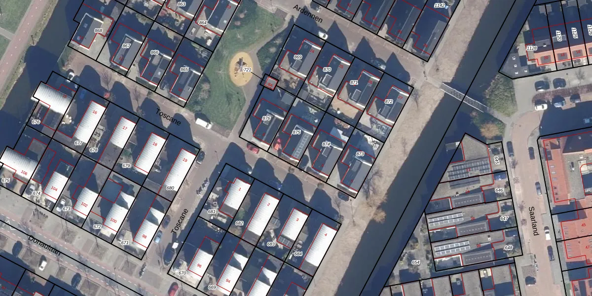 Het perceel waarop Toscane 7 staat heeft een oppervlakte van 237 m². Dit is een middelgroot perceel. De perceeloppervlakte wordt geregistreerd door het Kadaster. Gedetailleerde informatie over de maten van dit perceel kunt u vinden in het rapport Kadastrale kaart met maatvoering van Toscane 7.