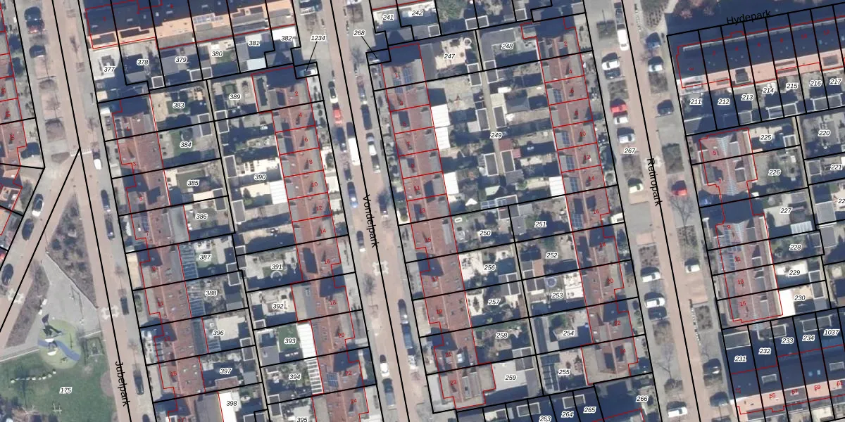 Het perceel waarop Vondelpark 13 staat heeft een oppervlakte van 1712 m². Dit is een zeer groot perceel. De perceeloppervlakte wordt geregistreerd door het Kadaster. Gedetailleerde informatie over de maten van dit perceel kunt u vinden in het rapport Kadastrale kaart met maatvoering van Vondelpark 13.