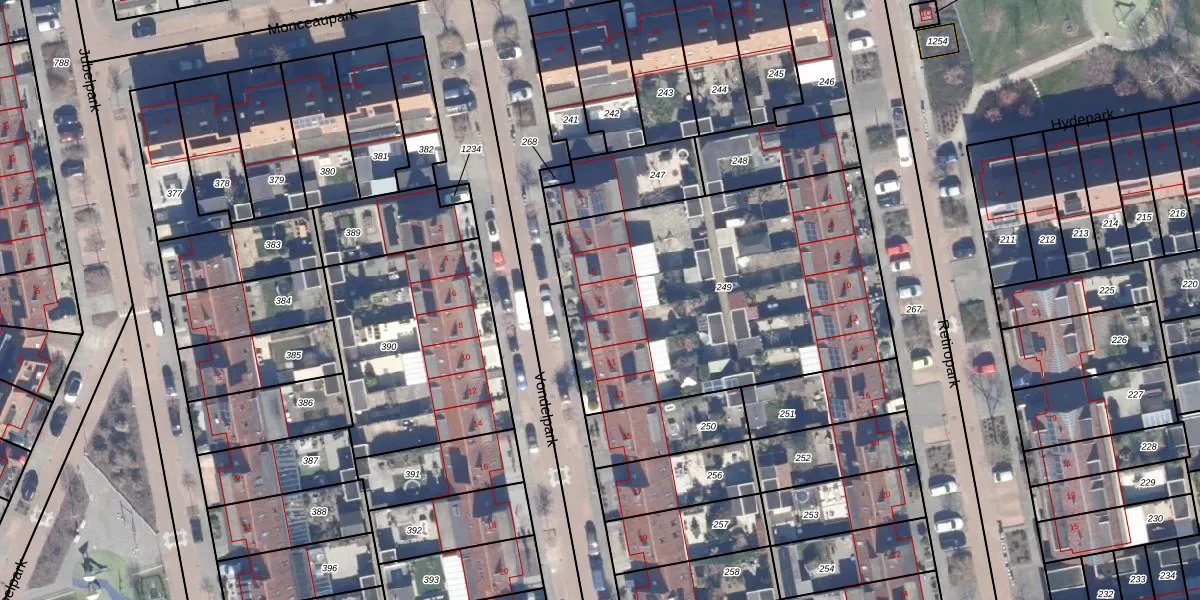 Het perceel waarop Vondelpark 7 staat heeft een oppervlakte van 1712 m². Dit is een zeer groot perceel. De perceeloppervlakte wordt geregistreerd door het Kadaster. Gedetailleerde informatie over de maten van dit perceel kunt u vinden in het rapport Kadastrale kaart met maatvoering van Vondelpark 7.