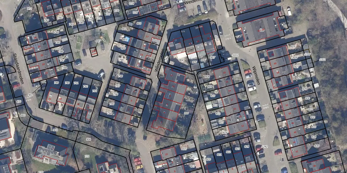 Het perceel waarop Weidemolen 10 staat heeft een oppervlakte van 879 m². Dit is een groot perceel. De perceeloppervlakte wordt geregistreerd door het Kadaster. Gedetailleerde informatie over de maten van dit perceel kunt u vinden in het rapport Kadastrale kaart met maatvoering van Weidemolen 10.