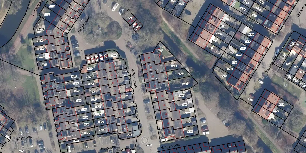 Het perceel waarop Wilgenroos 34 staat heeft een oppervlakte van 173 m². Dit is een middelgroot perceel. De perceeloppervlakte wordt geregistreerd door het Kadaster. Gedetailleerde informatie over de maten van dit perceel kunt u vinden in het rapport Kadastrale kaart met maatvoering van Wilgenroos 34.