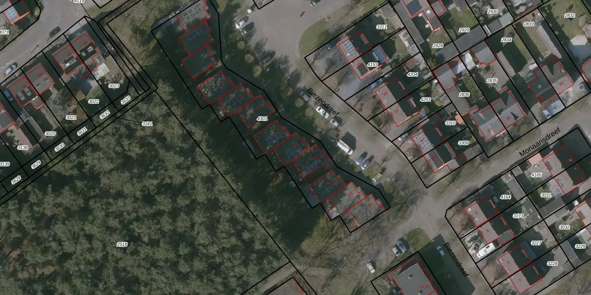 Het perceel waarop Biezendreef 25 staat heeft een oppervlakte van 1586 m². Dit is een zeer groot perceel. De perceeloppervlakte wordt geregistreerd door het Kadaster. Gedetailleerde informatie over de maten van dit perceel kunt u vinden in het rapport Kadastrale kaart met maatvoering van Biezendreef 25.