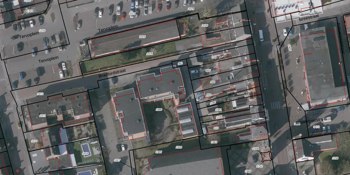 Het perceel waarop Bradfordstraat 33 staat heeft een oppervlakte van 2919 m². Dit is een zeer groot perceel. De perceeloppervlakte wordt geregistreerd door het Kadaster. Gedetailleerde informatie over de maten van dit perceel kunt u vinden in het rapport Kadastrale kaart met maatvoering van Bradfordstraat 33.