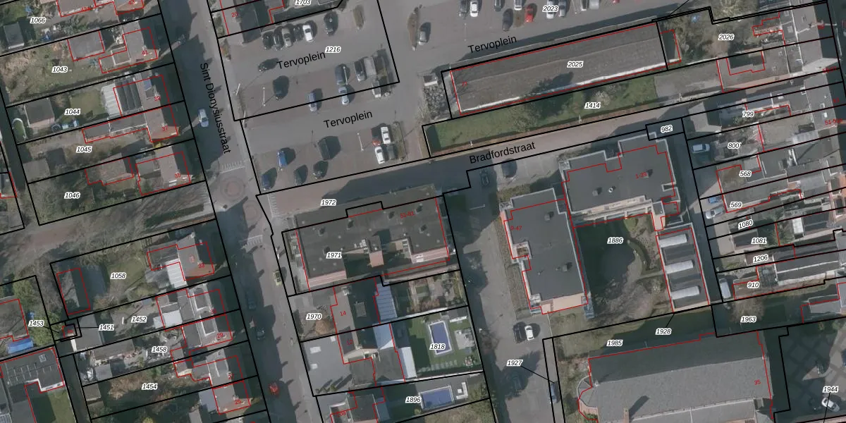 Het perceel waarop Bradfordstraat 53 staat heeft een oppervlakte van 652 m². Dit is een groot perceel. De perceeloppervlakte wordt geregistreerd door het Kadaster. Gedetailleerde informatie over de maten van dit perceel kunt u vinden in het rapport Kadastrale kaart met maatvoering van Bradfordstraat 53.