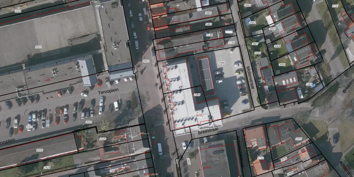 Het perceel waarop Breestraat 1-m staat heeft een oppervlakte van 1374 m². Dit is een zeer groot perceel. De perceeloppervlakte wordt geregistreerd door het Kadaster. Gedetailleerde informatie over de maten van dit perceel kunt u vinden in het rapport Kadastrale kaart met maatvoering van Breestraat 1-m.