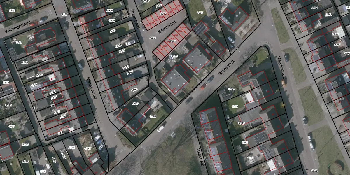 Het perceel waarop Breestraat 25 staat heeft een oppervlakte van 855 m². Dit is een groot perceel. De perceeloppervlakte wordt geregistreerd door het Kadaster. Gedetailleerde informatie over de maten van dit perceel kunt u vinden in het rapport Kadastrale kaart met maatvoering van Breestraat 25.