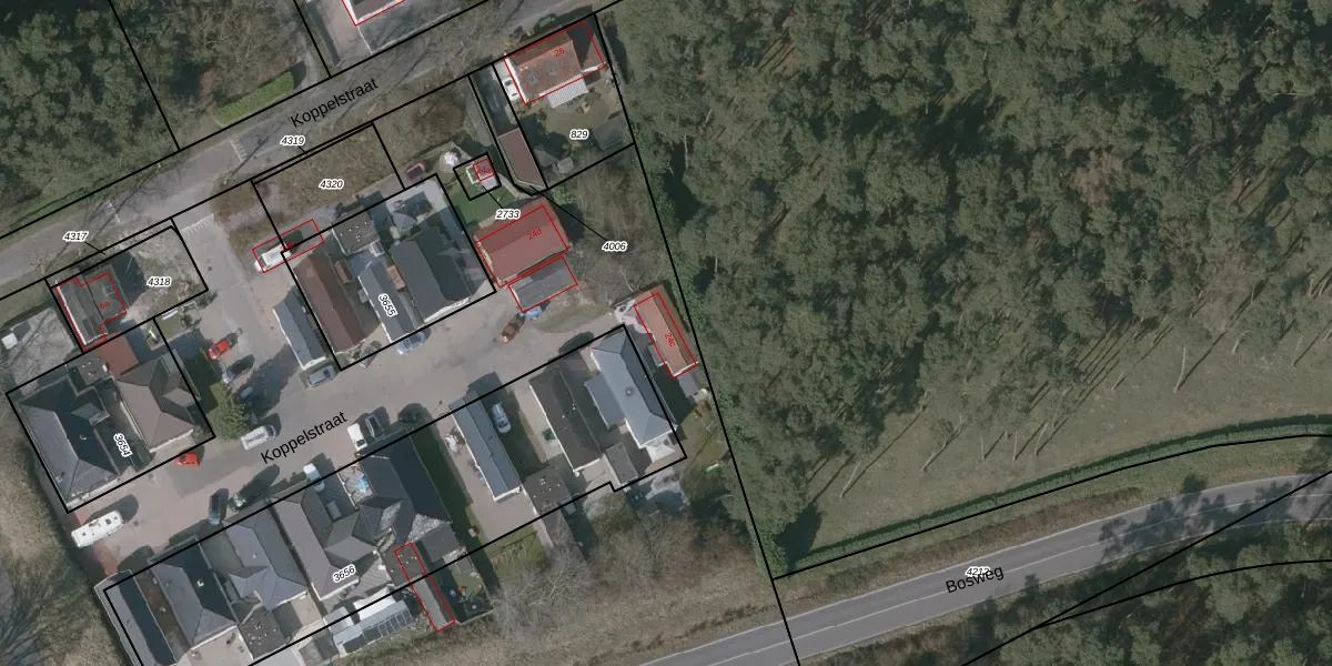 Het perceel waarop Koppelstraat 24-c staat heeft een oppervlakte van 1,2 ha. Dit is een zeer groot perceel. De perceeloppervlakte wordt geregistreerd door het Kadaster. Gedetailleerde informatie over de maten van dit perceel kunt u vinden in het rapport Kadastrale kaart met maatvoering van Koppelstraat 24-c.
