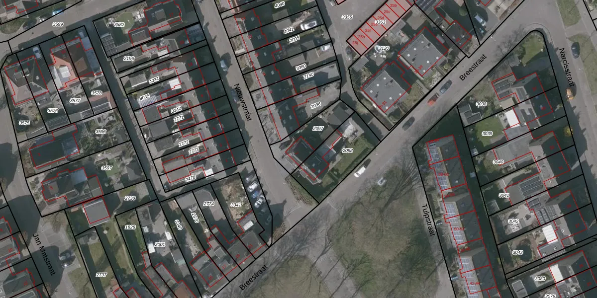 Het perceel waarop Nieuwstraat 2 staat heeft een oppervlakte van 262 m². Dit is een middelgroot perceel. De perceeloppervlakte wordt geregistreerd door het Kadaster. Gedetailleerde informatie over de maten van dit perceel kunt u vinden in het rapport Kadastrale kaart met maatvoering van Nieuwstraat 2.