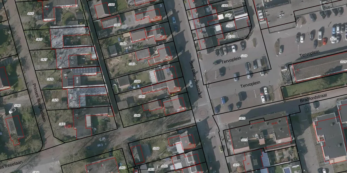 Het perceel waarop Sint Dionysiusstraat 37 staat heeft een oppervlakte van 389 m². Dit is een groot perceel. De perceeloppervlakte wordt geregistreerd door het Kadaster. Gedetailleerde informatie over de maten van dit perceel kunt u vinden in het rapport Kadastrale kaart met maatvoering van Sint Dionysiusstraat 37.