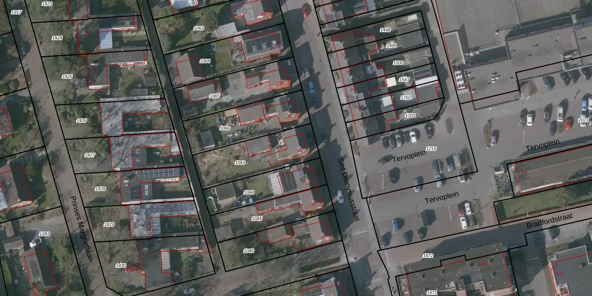 Het perceel waarop Sint Dionysiusstraat 41 staat heeft een oppervlakte van 509 m². Dit is een groot perceel. De perceeloppervlakte wordt geregistreerd door het Kadaster. Gedetailleerde informatie over de maten van dit perceel kunt u vinden in het rapport Kadastrale kaart met maatvoering van Sint Dionysiusstraat 41.