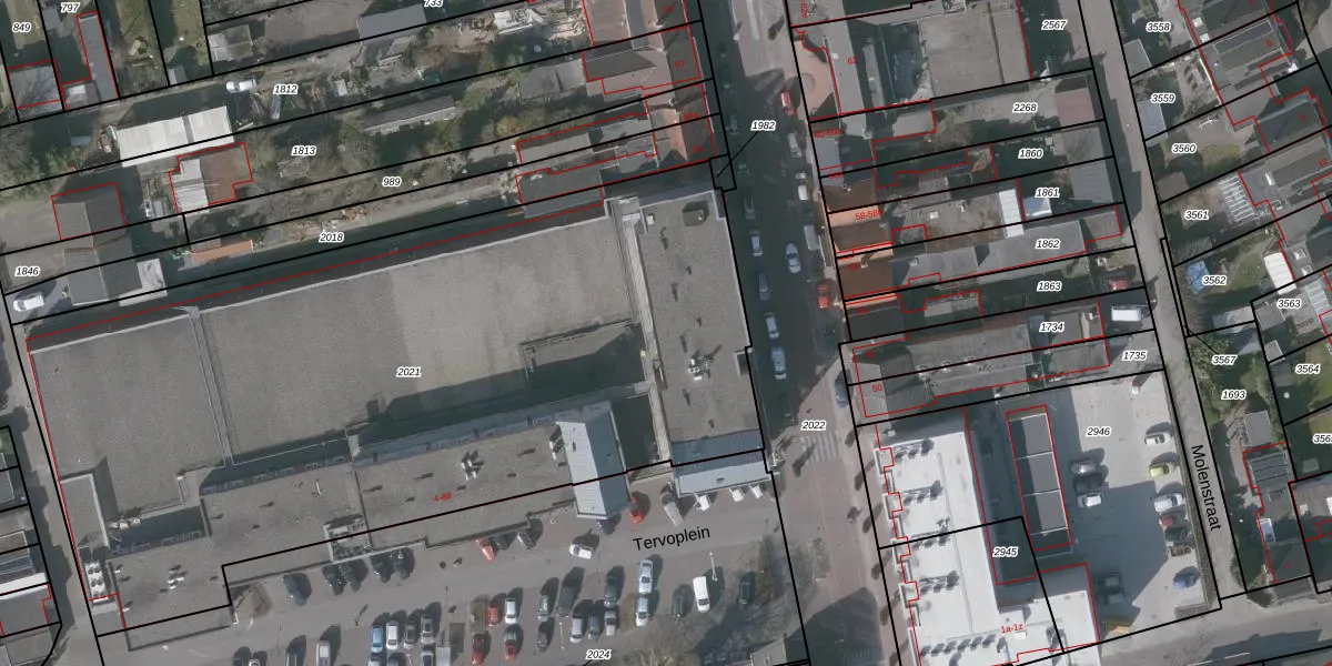 Het perceel waarop Tervoplein 44 staat heeft een oppervlakte van 4684 m². Dit is een zeer groot perceel. De perceeloppervlakte wordt geregistreerd door het Kadaster. Gedetailleerde informatie over de maten van dit perceel kunt u vinden in het rapport Kadastrale kaart met maatvoering van Tervoplein 44.