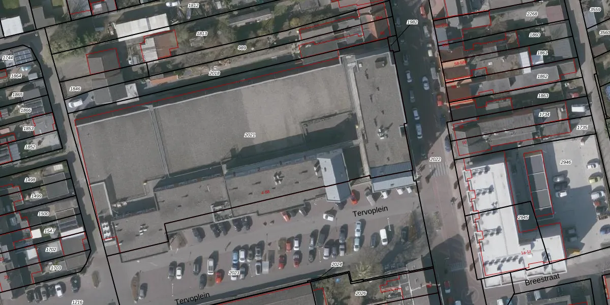 Het perceel waarop Tervoplein 52 staat heeft een oppervlakte van 4684 m². Dit is een zeer groot perceel. De perceeloppervlakte wordt geregistreerd door het Kadaster. Gedetailleerde informatie over de maten van dit perceel kunt u vinden in het rapport Kadastrale kaart met maatvoering van Tervoplein 52.