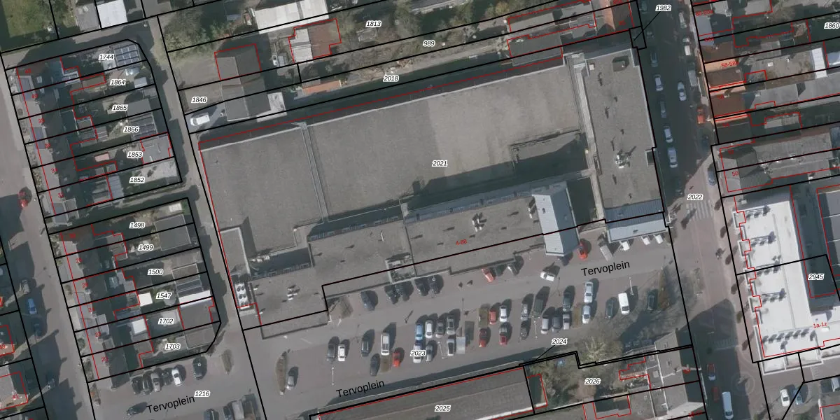 Het perceel waarop Tervoplein 58 staat heeft een oppervlakte van 4684 m². Dit is een zeer groot perceel. De perceeloppervlakte wordt geregistreerd door het Kadaster. Gedetailleerde informatie over de maten van dit perceel kunt u vinden in het rapport Kadastrale kaart met maatvoering van Tervoplein 58.