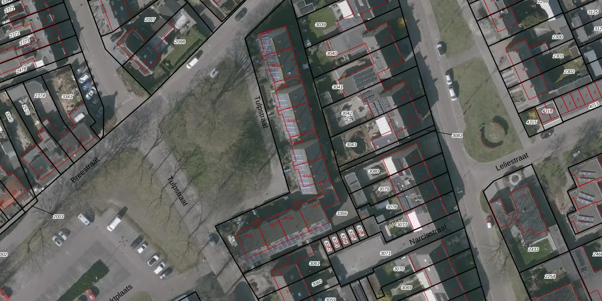 Het perceel waarop Tulpstraat 46 staat heeft een oppervlakte van 1835 m². Dit is een zeer groot perceel. De perceeloppervlakte wordt geregistreerd door het Kadaster. Gedetailleerde informatie over de maten van dit perceel kunt u vinden in het rapport Kadastrale kaart met maatvoering van Tulpstraat 46.