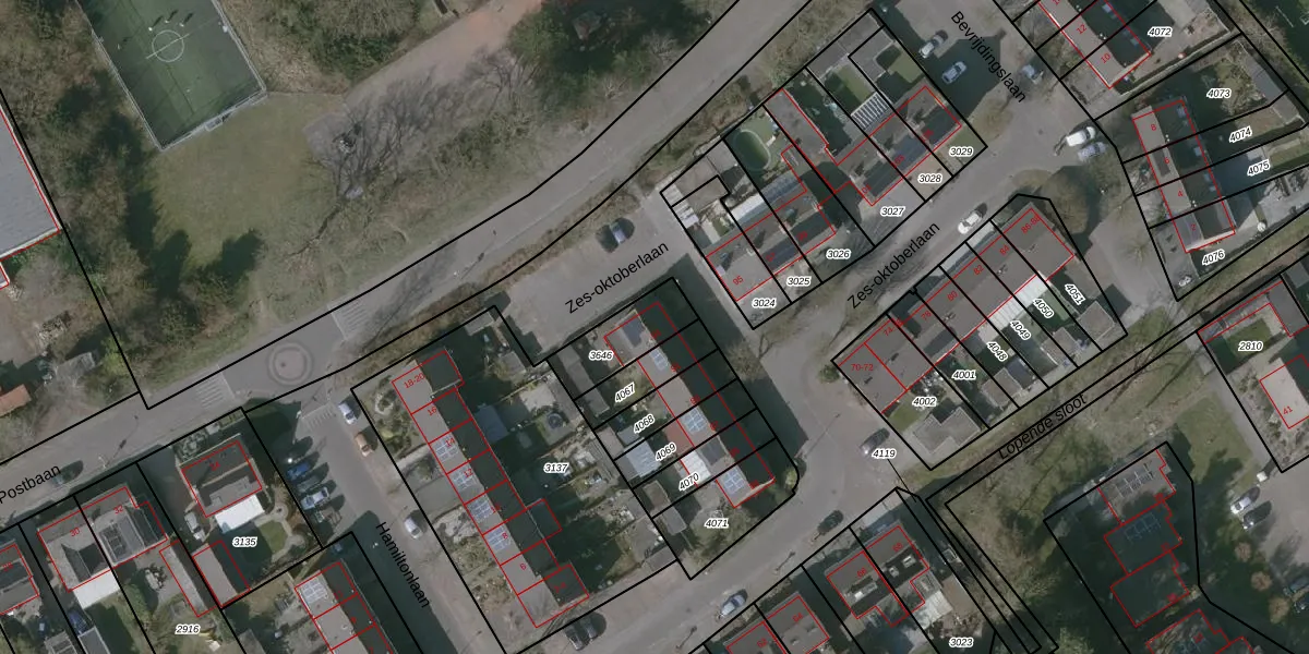 Het perceel waarop Zes-oktoberlaan 93 staat heeft een oppervlakte van 175 m². Dit is een middelgroot perceel. De perceeloppervlakte wordt geregistreerd door het Kadaster. Gedetailleerde informatie over de maten van dit perceel kunt u vinden in het rapport Kadastrale kaart met maatvoering van Zes-oktoberlaan 93.