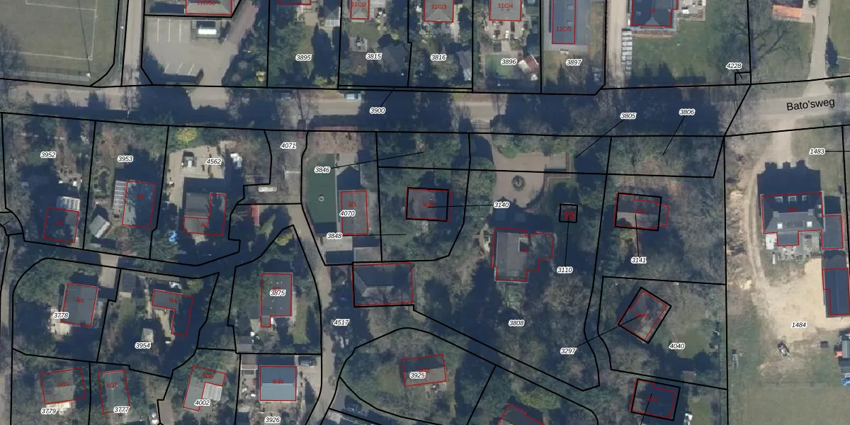 Het perceel waarop Bato'sweg 8-48 staat heeft een oppervlakte van 69 m². Dit is een klein perceel. De perceeloppervlakte wordt geregistreerd door het Kadaster. Gedetailleerde informatie over de maten van dit perceel kunt u vinden in het rapport Kadastrale kaart met maatvoering van Bato'sweg 8-48.