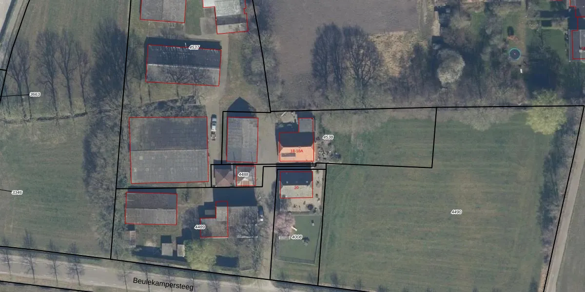 Beulekampersteeg 18 is gelegen op kadastraal perceel PTN01F4538. Deze kadastrale aanduiding is uniek en wordt gebruikt door het Kadaster om eigendomsrechten en andere zakelijke rechten vast te leggen. Het perceel maakt onderdeel uit van de kadastrale gemeente Putten.