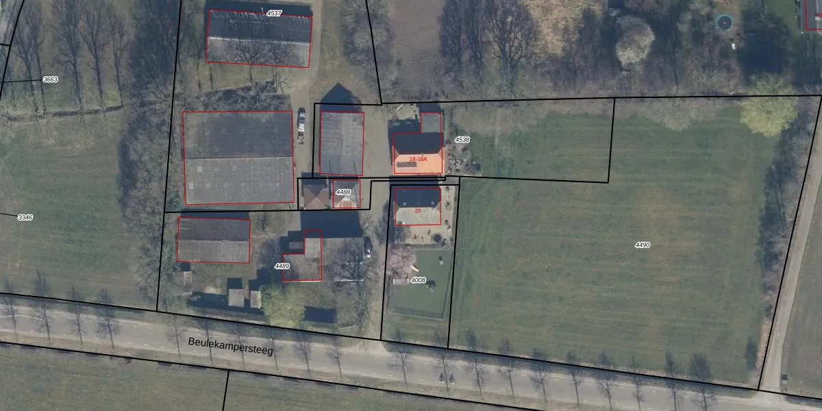 Beulekampersteeg 20 is gelegen op kadastraal perceel PTN01F4008. Deze kadastrale aanduiding is uniek en wordt gebruikt door het Kadaster om eigendomsrechten en andere zakelijke rechten vast te leggen. Het perceel maakt onderdeel uit van de kadastrale gemeente Putten.