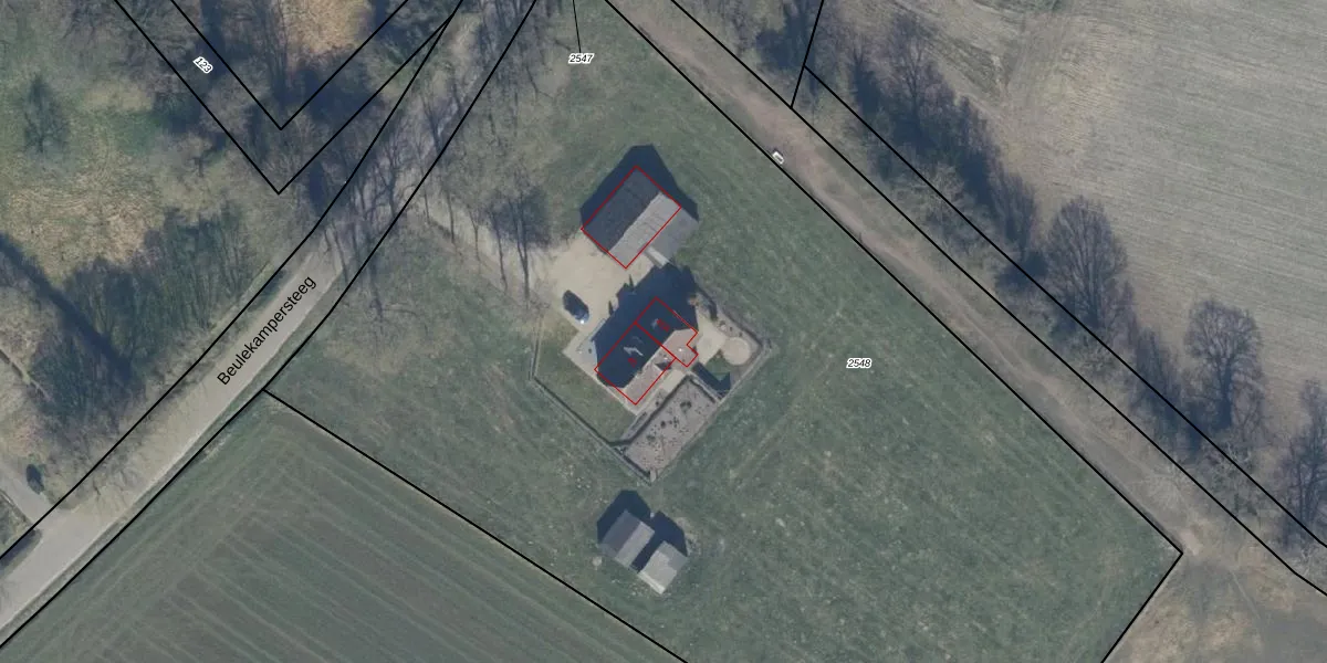 Het perceel waarop Beulekampersteeg 45-A staat heeft een oppervlakte van 8333 m². Dit is een zeer groot perceel. De perceeloppervlakte wordt geregistreerd door het Kadaster. Gedetailleerde informatie over de maten van dit perceel kunt u vinden in het rapport Kadastrale kaart met maatvoering van Beulekampersteeg 45-A.