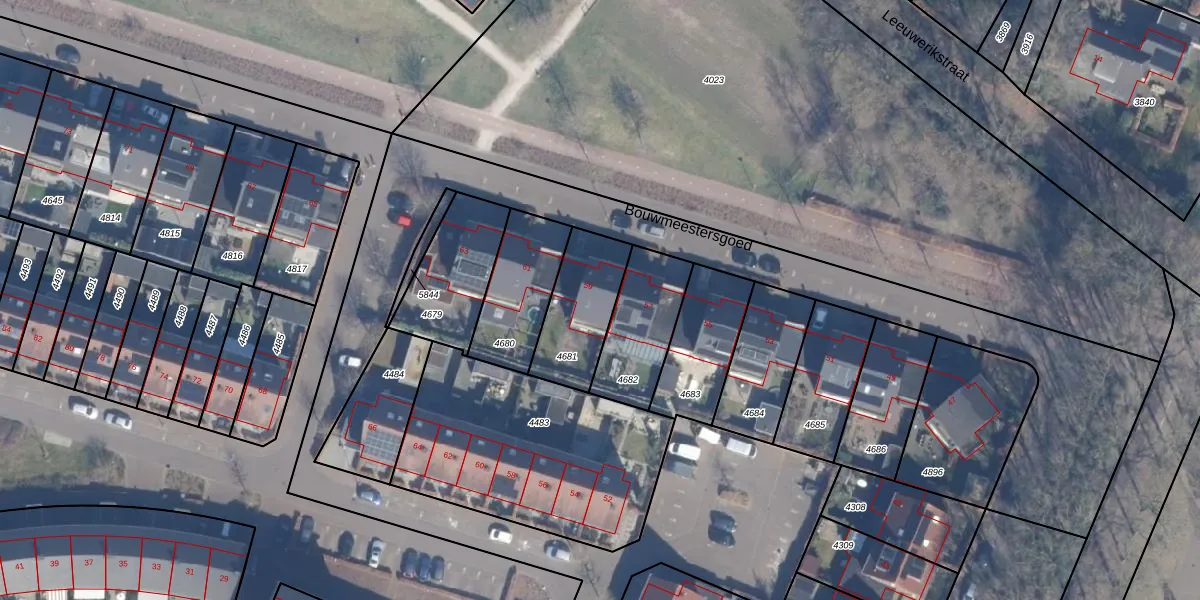 Het perceel waarop Bouwmeestersgoed 59 staat heeft een oppervlakte van 272 m². Dit is een middelgroot perceel. De perceeloppervlakte wordt geregistreerd door het Kadaster. Gedetailleerde informatie over de maten van dit perceel kunt u vinden in het rapport Kadastrale kaart met maatvoering van Bouwmeestersgoed 59.