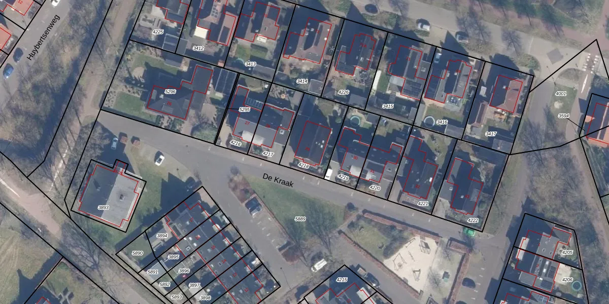Het perceel waarop De Kraak 29 staat heeft een oppervlakte van 386 m². Dit is een groot perceel. De perceeloppervlakte wordt geregistreerd door het Kadaster. Gedetailleerde informatie over de maten van dit perceel kunt u vinden in het rapport Kadastrale kaart met maatvoering van De Kraak 29.