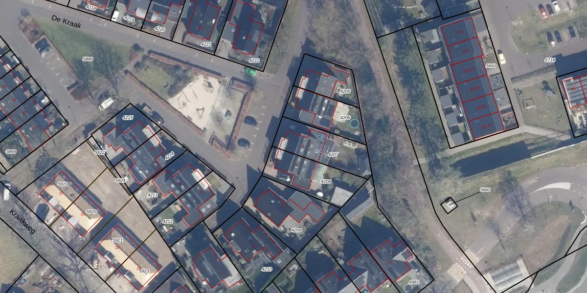 Het perceel waarop De Kraak 3 staat heeft een oppervlakte van 361 m². Dit is een groot perceel. De perceeloppervlakte wordt geregistreerd door het Kadaster. Gedetailleerde informatie over de maten van dit perceel kunt u vinden in het rapport Kadastrale kaart met maatvoering van De Kraak 3.