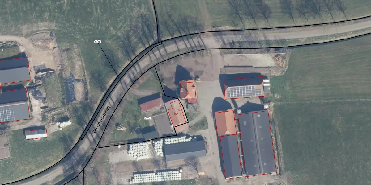 Het perceel waarop Diermenseweg 21 staat heeft een oppervlakte van 6,4 ha. Dit is een zeer groot perceel. De perceeloppervlakte wordt geregistreerd door het Kadaster. Gedetailleerde informatie over de maten van dit perceel kunt u vinden in het rapport Kadastrale kaart met maatvoering van Diermenseweg 21.
