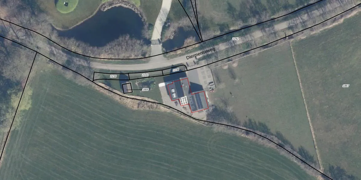 Het perceel waarop Diermenseweg 9 staat heeft een oppervlakte van 1,6 ha. Dit is een zeer groot perceel. De perceeloppervlakte wordt geregistreerd door het Kadaster. Gedetailleerde informatie over de maten van dit perceel kunt u vinden in het rapport Kadastrale kaart met maatvoering van Diermenseweg 9.
