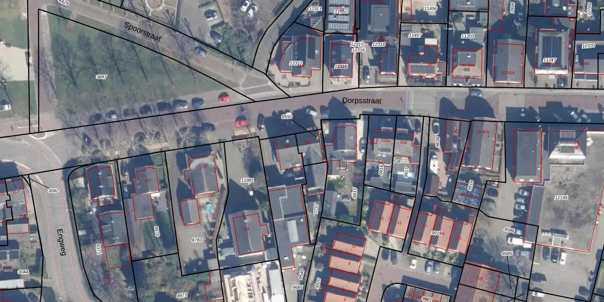 Het perceel waarop Dorpsstraat 107 staat heeft een oppervlakte van 93 m². Dit is een klein perceel. De perceeloppervlakte wordt geregistreerd door het Kadaster. Gedetailleerde informatie over de maten van dit perceel kunt u vinden in het rapport Kadastrale kaart met maatvoering van Dorpsstraat 107.
