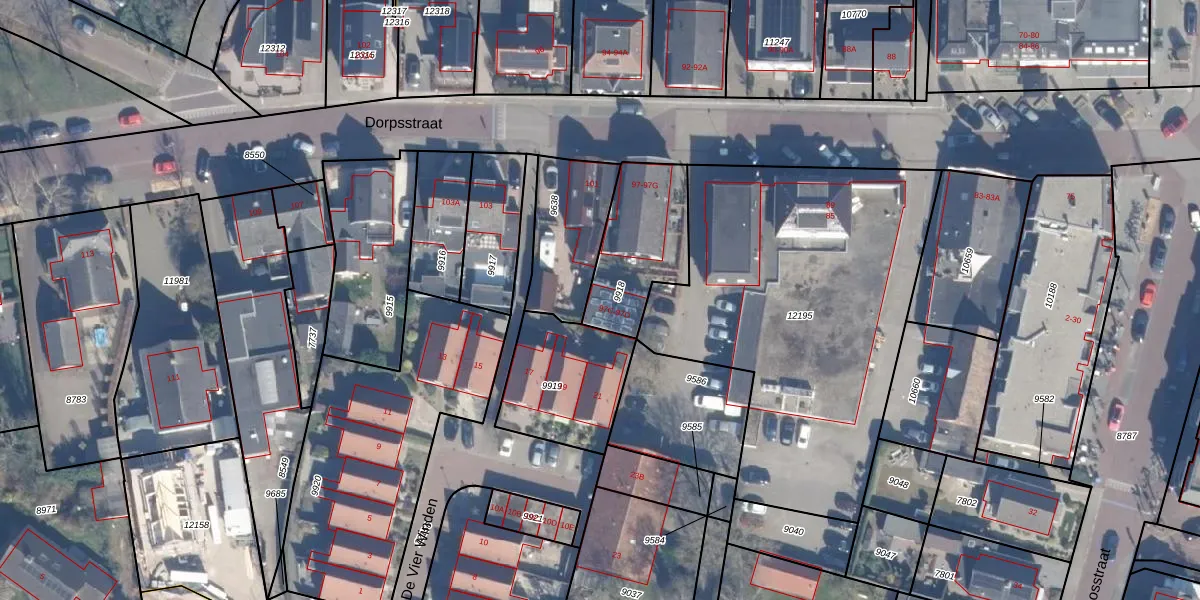 Het perceel waarop Dorpsstraat 97-D staat heeft een oppervlakte van 395 m². Dit is een groot perceel. De perceeloppervlakte wordt geregistreerd door het Kadaster. Gedetailleerde informatie over de maten van dit perceel kunt u vinden in het rapport Kadastrale kaart met maatvoering van Dorpsstraat 97-D.