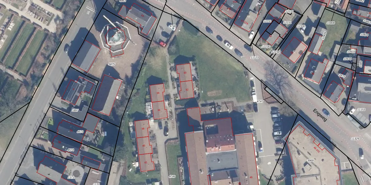 Het perceel waarop Engweg 32 staat heeft een oppervlakte van 1,1 ha. Dit is een zeer groot perceel. De perceeloppervlakte wordt geregistreerd door het Kadaster. Gedetailleerde informatie over de maten van dit perceel kunt u vinden in het rapport Kadastrale kaart met maatvoering van Engweg 32.