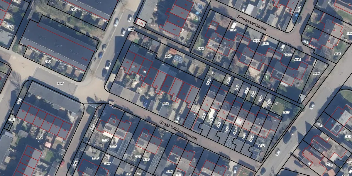Het perceel waarop Graaf Wichmanstraat 22 staat heeft een oppervlakte van 1363 m². Dit is een zeer groot perceel. De perceeloppervlakte wordt geregistreerd door het Kadaster. Gedetailleerde informatie over de maten van dit perceel kunt u vinden in het rapport Kadastrale kaart met maatvoering van Graaf Wichmanstraat 22.