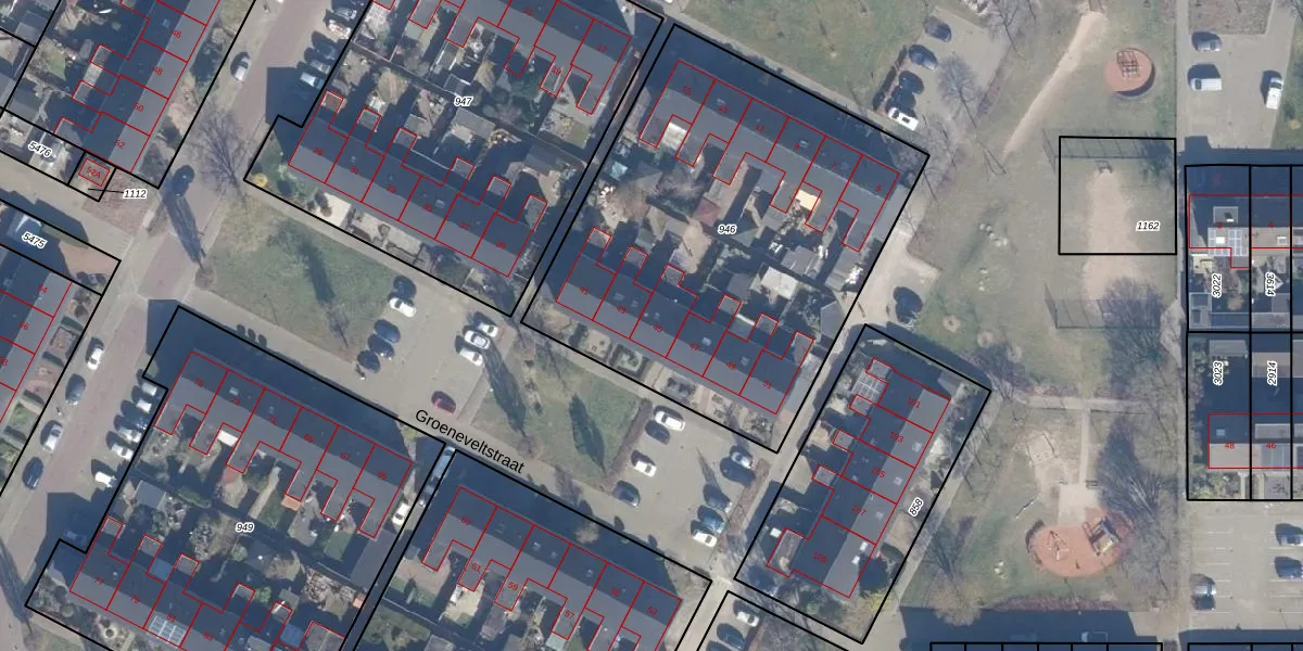 Het perceel waarop Groeneveltstraat 45 staat heeft een oppervlakte van 2263 m². Dit is een zeer groot perceel. De perceeloppervlakte wordt geregistreerd door het Kadaster. Gedetailleerde informatie over de maten van dit perceel kunt u vinden in het rapport Kadastrale kaart met maatvoering van Groeneveltstraat 45.