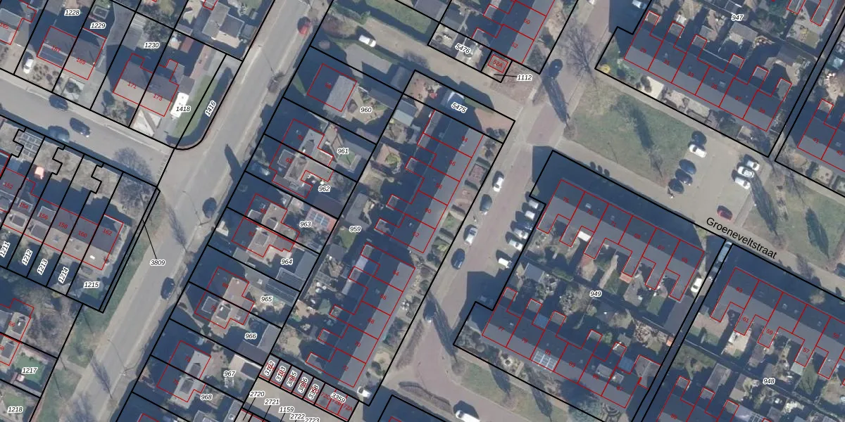 Het perceel waarop Groeneveltstraat 60 staat heeft een oppervlakte van 1843 m². Dit is een zeer groot perceel. De perceeloppervlakte wordt geregistreerd door het Kadaster. Gedetailleerde informatie over de maten van dit perceel kunt u vinden in het rapport Kadastrale kaart met maatvoering van Groeneveltstraat 60.