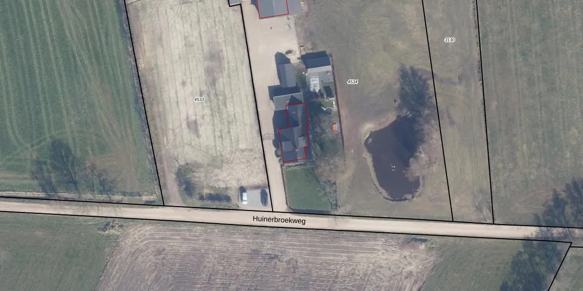 Het perceel waarop Huinerbroekweg 1 staat heeft een oppervlakte van 5695 m². Dit is een zeer groot perceel. De perceeloppervlakte wordt geregistreerd door het Kadaster. Gedetailleerde informatie over de maten van dit perceel kunt u vinden in het rapport Kadastrale kaart met maatvoering van Huinerbroekweg 1.