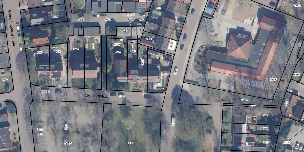 Het perceel waarop Leijsbornstraat 2 staat heeft een oppervlakte van 388 m². Dit is een groot perceel. De perceeloppervlakte wordt geregistreerd door het Kadaster. Gedetailleerde informatie over de maten van dit perceel kunt u vinden in het rapport Kadastrale kaart met maatvoering van Leijsbornstraat 2.