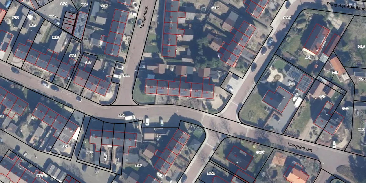 Het perceel waarop Margrietlaan 25 staat heeft een oppervlakte van 5955 m². Dit is een zeer groot perceel. De perceeloppervlakte wordt geregistreerd door het Kadaster. Gedetailleerde informatie over de maten van dit perceel kunt u vinden in het rapport Kadastrale kaart met maatvoering van Margrietlaan 25.
