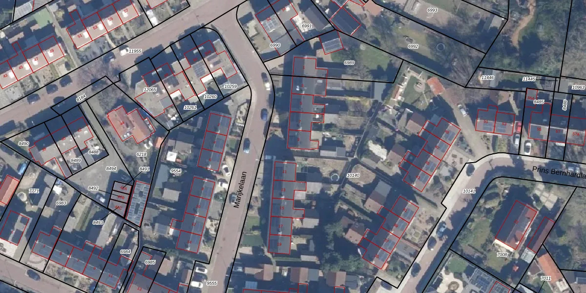 Het perceel waarop Marijkelaan 9 staat heeft een oppervlakte van 5955 m². Dit is een zeer groot perceel. De perceeloppervlakte wordt geregistreerd door het Kadaster. Gedetailleerde informatie over de maten van dit perceel kunt u vinden in het rapport Kadastrale kaart met maatvoering van Marijkelaan 9.