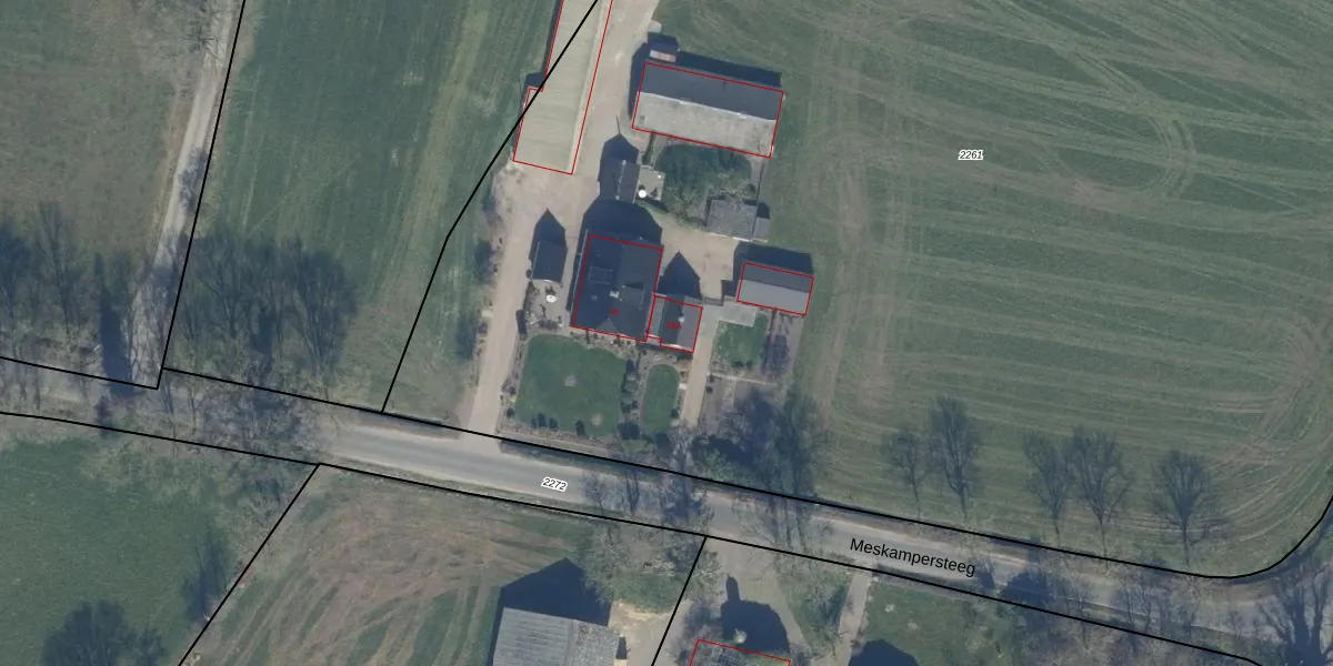 Het perceel waarop Meskampersteeg 18-A staat heeft een oppervlakte van 1,6 ha. Dit is een zeer groot perceel. De perceeloppervlakte wordt geregistreerd door het Kadaster. Gedetailleerde informatie over de maten van dit perceel kunt u vinden in het rapport Kadastrale kaart met maatvoering van Meskampersteeg 18-A.