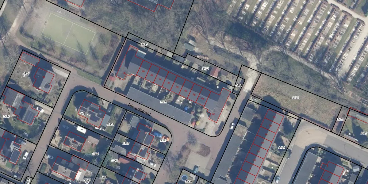 Het perceel waarop Picardstraat 28 staat heeft een oppervlakte van 1998 m². Dit is een zeer groot perceel. De perceeloppervlakte wordt geregistreerd door het Kadaster. Gedetailleerde informatie over de maten van dit perceel kunt u vinden in het rapport Kadastrale kaart met maatvoering van Picardstraat 28.