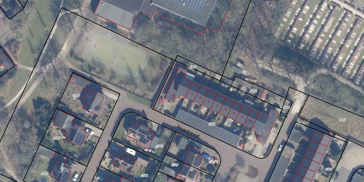 Het perceel waarop Picardstraat 40 staat heeft een oppervlakte van 1998 m². Dit is een zeer groot perceel. De perceeloppervlakte wordt geregistreerd door het Kadaster. Gedetailleerde informatie over de maten van dit perceel kunt u vinden in het rapport Kadastrale kaart met maatvoering van Picardstraat 40.
