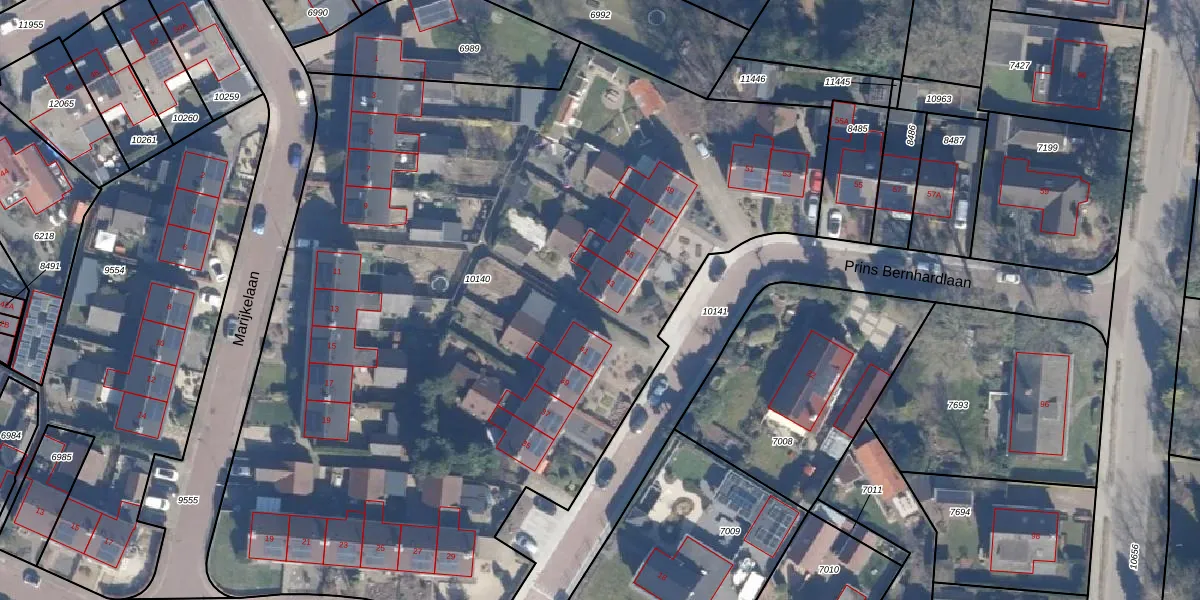 Het perceel waarop Prins Bernhardlaan 43 staat heeft een oppervlakte van 5955 m². Dit is een zeer groot perceel. De perceeloppervlakte wordt geregistreerd door het Kadaster. Gedetailleerde informatie over de maten van dit perceel kunt u vinden in het rapport Kadastrale kaart met maatvoering van Prins Bernhardlaan 43.