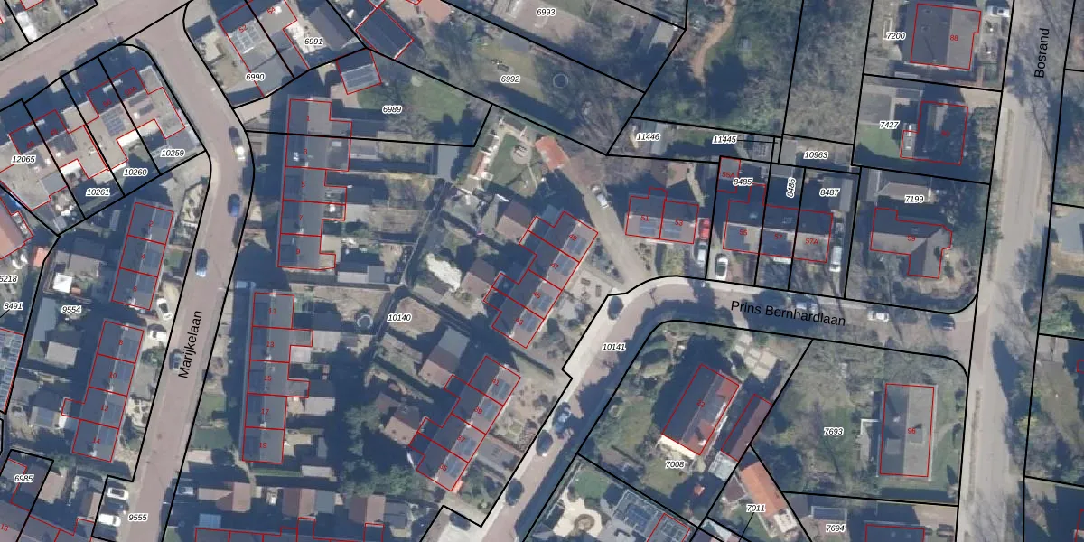Het perceel waarop Prins Bernhardlaan 47 staat heeft een oppervlakte van 5955 m². Dit is een zeer groot perceel. De perceeloppervlakte wordt geregistreerd door het Kadaster. Gedetailleerde informatie over de maten van dit perceel kunt u vinden in het rapport Kadastrale kaart met maatvoering van Prins Bernhardlaan 47.