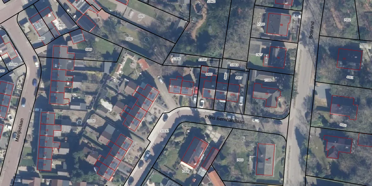 Het perceel waarop Prins Bernhardlaan 53 staat heeft een oppervlakte van 5955 m². Dit is een zeer groot perceel. De perceeloppervlakte wordt geregistreerd door het Kadaster. Gedetailleerde informatie over de maten van dit perceel kunt u vinden in het rapport Kadastrale kaart met maatvoering van Prins Bernhardlaan 53.