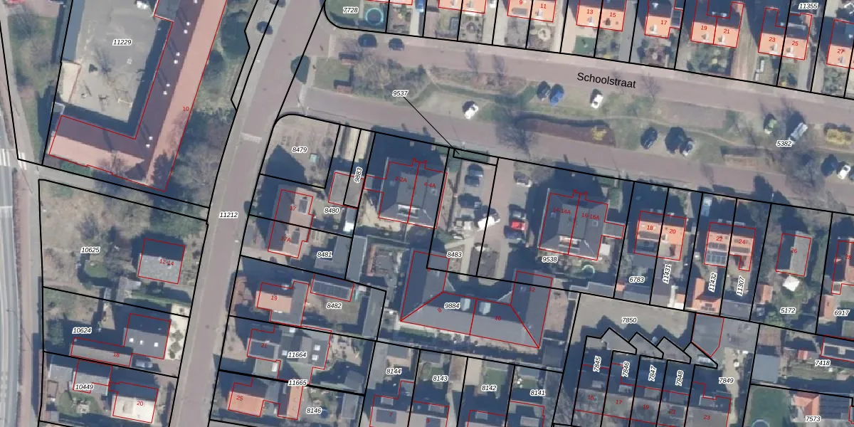 Het perceel waarop Schoolstraat 4-A staat heeft een oppervlakte van 1419 m². Dit is een zeer groot perceel. De perceeloppervlakte wordt geregistreerd door het Kadaster. Gedetailleerde informatie over de maten van dit perceel kunt u vinden in het rapport Kadastrale kaart met maatvoering van Schoolstraat 4-A.