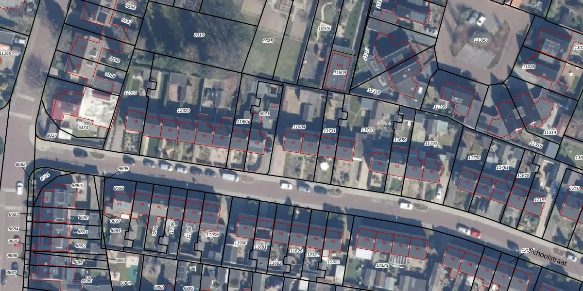 Het perceel waarop Schoolstraat 51 staat heeft een oppervlakte van 500 m². Dit is een groot perceel. De perceeloppervlakte wordt geregistreerd door het Kadaster. Gedetailleerde informatie over de maten van dit perceel kunt u vinden in het rapport Kadastrale kaart met maatvoering van Schoolstraat 51.