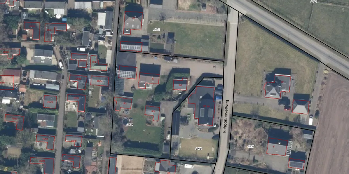Het perceel waarop Schoonhoverweg 8-2 staat heeft een oppervlakte van 2420 m². Dit is een zeer groot perceel. De perceeloppervlakte wordt geregistreerd door het Kadaster. Gedetailleerde informatie over de maten van dit perceel kunt u vinden in het rapport Kadastrale kaart met maatvoering van Schoonhoverweg 8-2.