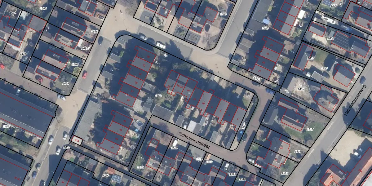 Het perceel waarop Schrassertstraat 14 staat heeft een oppervlakte van 3715 m². Dit is een zeer groot perceel. De perceeloppervlakte wordt geregistreerd door het Kadaster. Gedetailleerde informatie over de maten van dit perceel kunt u vinden in het rapport Kadastrale kaart met maatvoering van Schrassertstraat 14.
