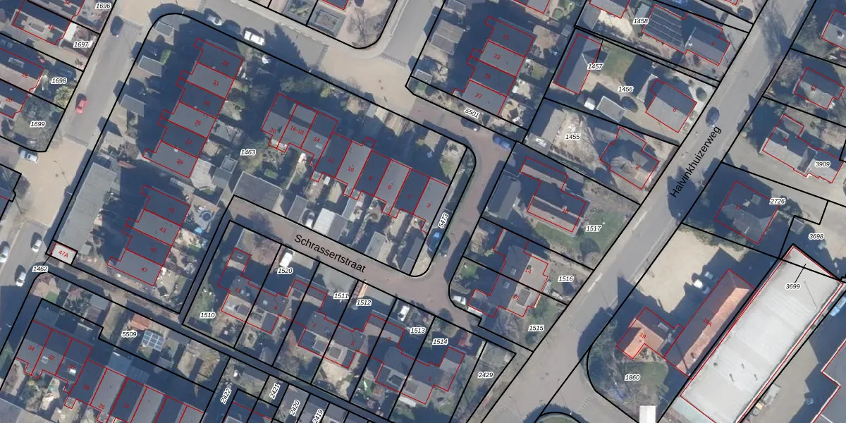 Het perceel waarop Schrassertstraat 2 staat heeft een oppervlakte van 3715 m². Dit is een zeer groot perceel. De perceeloppervlakte wordt geregistreerd door het Kadaster. Gedetailleerde informatie over de maten van dit perceel kunt u vinden in het rapport Kadastrale kaart met maatvoering van Schrassertstraat 2.
